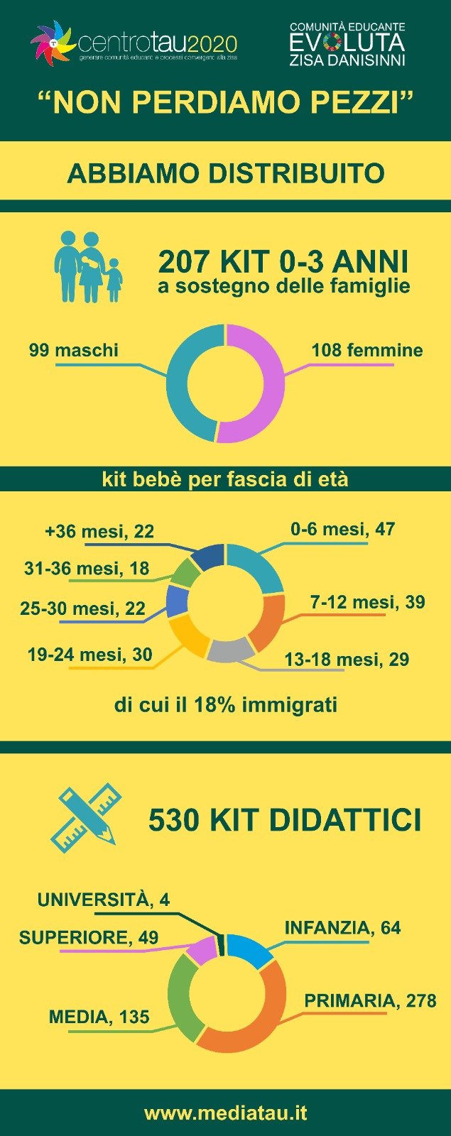 Nel raccordo sull’assistenza il Centro Tau ha gestito la distribuzione dei beni alimentari e di prima necessità per i bambini da zero a tre anni. Un modo per alleggerire il carico delle parrocchie e nello stesso tempo attivare un contatto di sostegno e di supporto per le famiglie dei bambini. Sono stati accolti oltre 200 bambini e bambine, la maggior parte residenti nel territorio della Comunità Educante. L’incontro con questi bambini e le loro famiglie ci dà la possibilità di guardare al futuro, di avviare iniziative educative a partire da questo importante periodo della vita per una crescita sana ed equilibrata. Una importante sfida della comunità per i prossimi mesi.